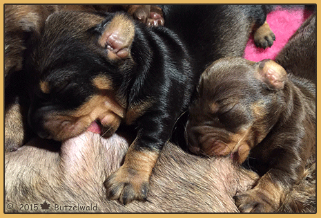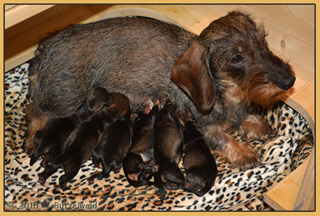 Bei der Aufzucht geben wir uns die größte Mühe die Welpen mit viel Liebe und Zeit so gut wie möglich zu prägen und zu sozialisieren (Autofahren, Kinder, Haushaltsgeräusche, Verkehr, andere Hunde). Besuche von den zukünftigen Besitzern sind nach Absprache jederzeit gerne gesehen, ja sogar erwünscht! Nach der 1. Impfung lernen die Welpen auch Wald und Feld kennen und sofern die Besitzer in Berlin und Umland wohnen, können die Welpen ihr neues Zuhause auch schon einmal in Begleitung von Mutter und Geschwistern kennenlernen. |